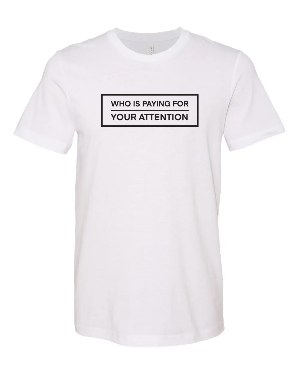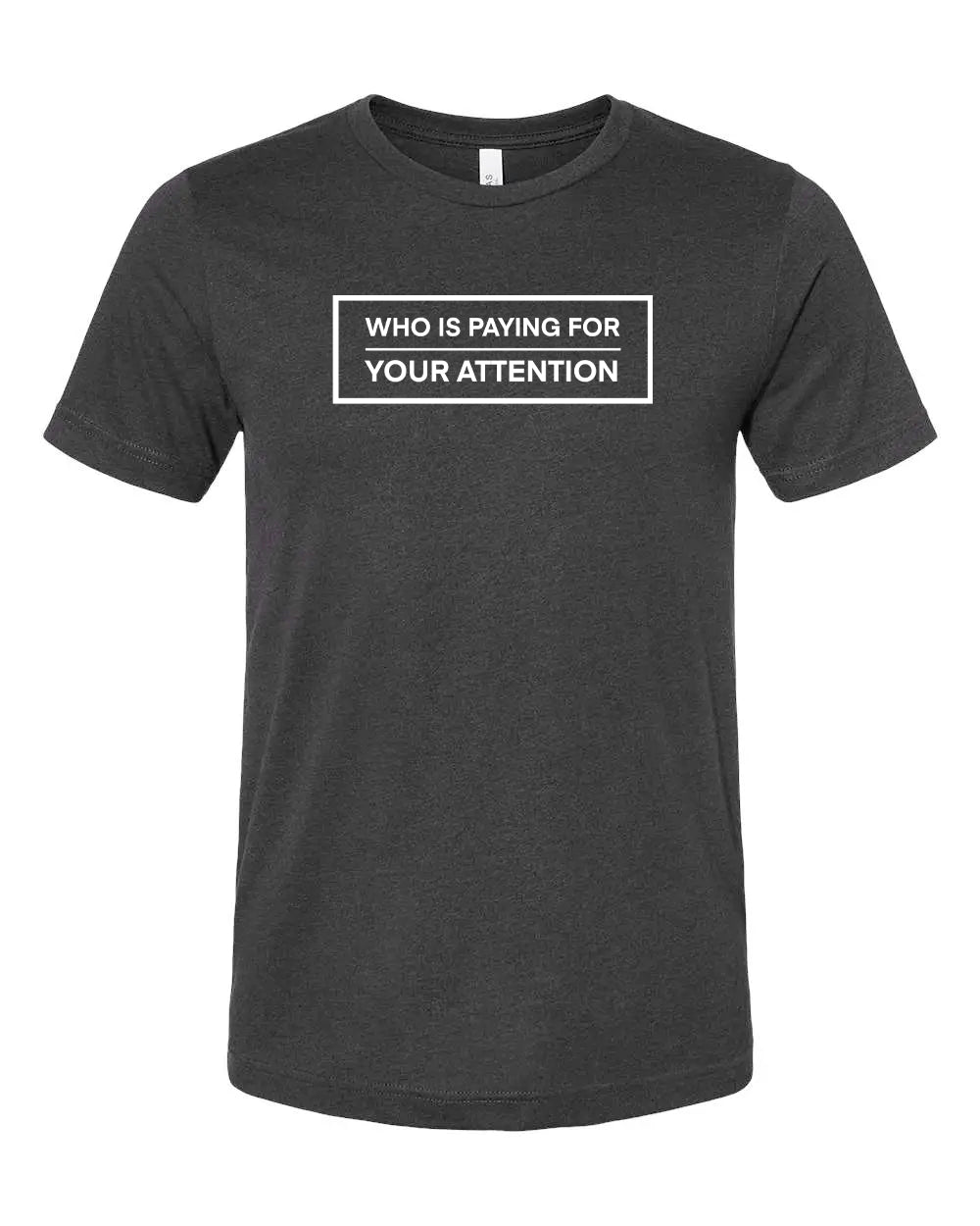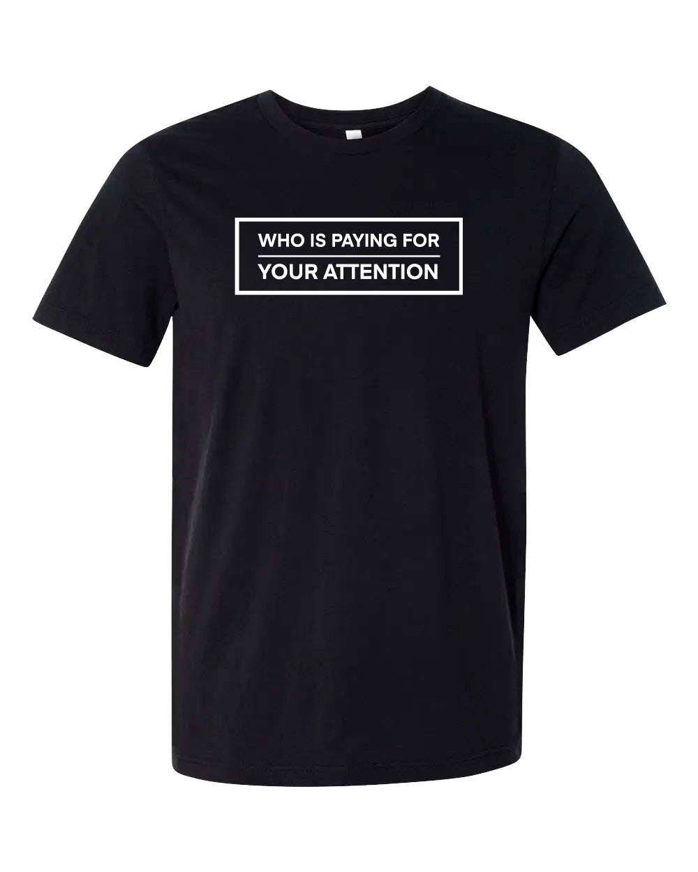 Unisex T-Shirts featuring the Who is Paying for your Attention design. Fair trade and eco-sustainable apparel.